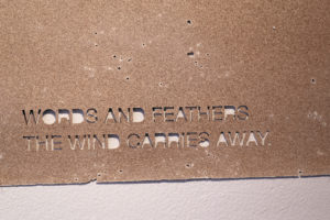 The eight proverbs presented in this installation address seeing and saying, witnessing and expressing. Presented through both audio and abrasive, they suggest a moral mandate about when, where, and how one should speak out or take notice. These words about seeing and speaking suggest a kind of willful blindness, just as proverbs themselves allow blindness in their refusal to engage further discussion or dialogue.